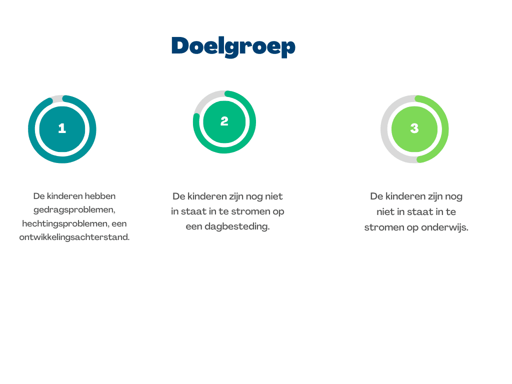 Bij sommige kinderen is 1-op-1 begeleiding op lange termijn de enige en de laatste optie. Vanwege de problematiek is het instromen op een dagbesteding of school niet mogelijk of wenselijk. Ook deze kinderen horen een plekje te krijgen waar de ontwikkeling en behoud van vaardigheden centraal staat.